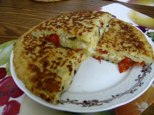 - Egy serpenyöben(palacsinta sütöben) melegítsük fel a zsírt/olajat.A sütö egész nagyságára terítsünk ki egy vékony réteg burgonya tésztát,vegyük le alatta a lángot(höt) és erre rakjunk: szalámi-hagyma/póré-sajt-petrezselyemzöld-zellerzöld.Ezt takarjuk le egy vékony réteg burgonya tésztával.Takarjuk le födövel és alacsony lángon süssük amíg az alja átt nem sül(cca 5-8 perc).Egy lapos tányérra átcsúsztatjuk a tésztát ,ráhelyezzük a sütöt és belefordítjuk a tésztát.Megint letakarjuk és ezt a másik felét is megsütjük(cca 5-8 perc).